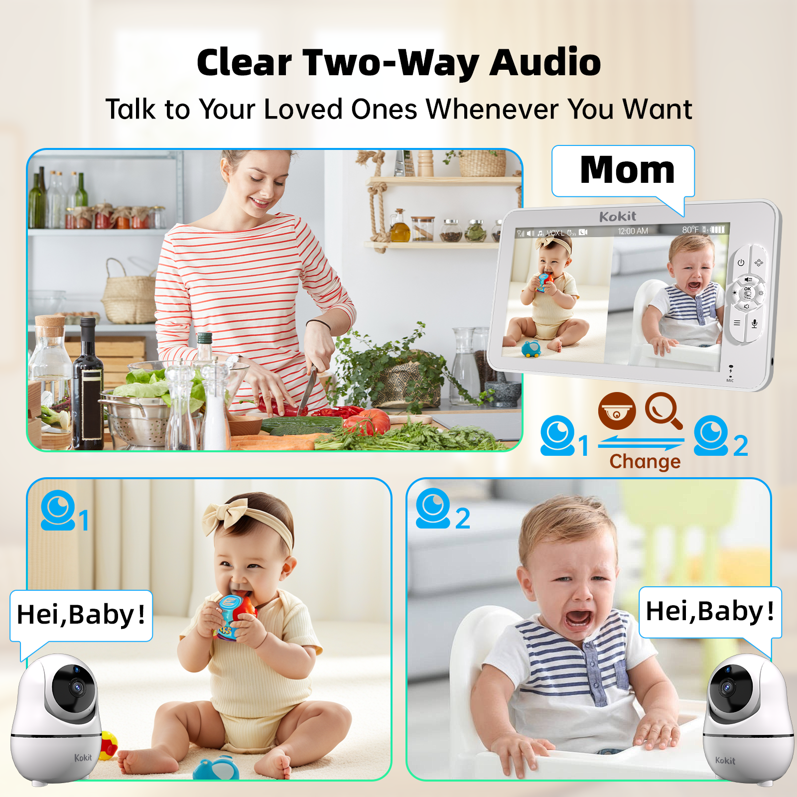 The KOKIT 7" 1080P Split-Screen Baby Monitor is designed for parents who need reliable, real-time monitoring without WiFi risks. With a 7-inch HD display, dual Full HD cameras, long-lasting 5000mAh rechargeable battery, and a secure FHSS connection, it delivers clarity, safety, and convenience all day and night.